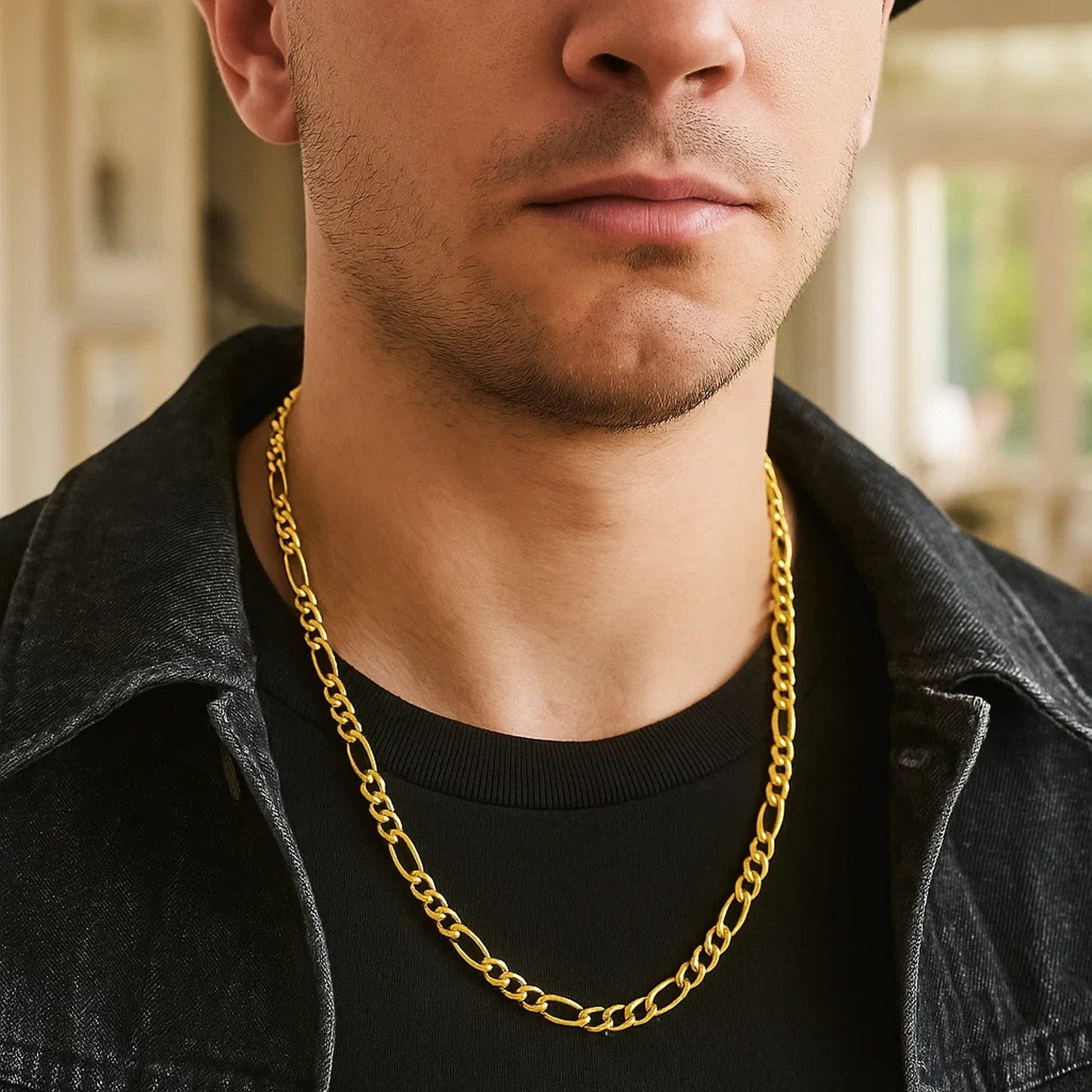 This solid Figaro chain comes in 14k yellow gold and has a width of 6.0 millimeters.