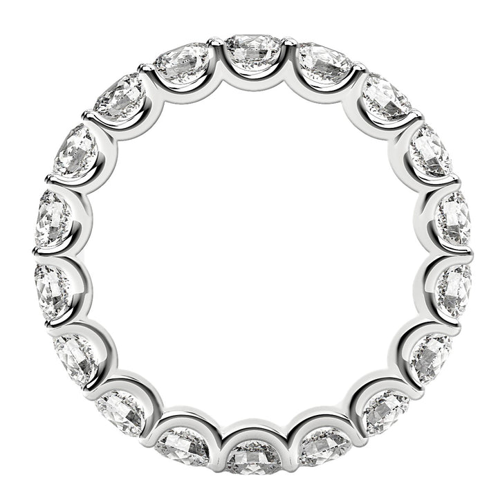 Intriguing curved prongs of glimmering 14k white gold encircle beautiful round cut lab grown diamonds with elegant, arch-like waves of shine in this spectacular eternity ring, adding contrast and organic shape to a traditional setting.