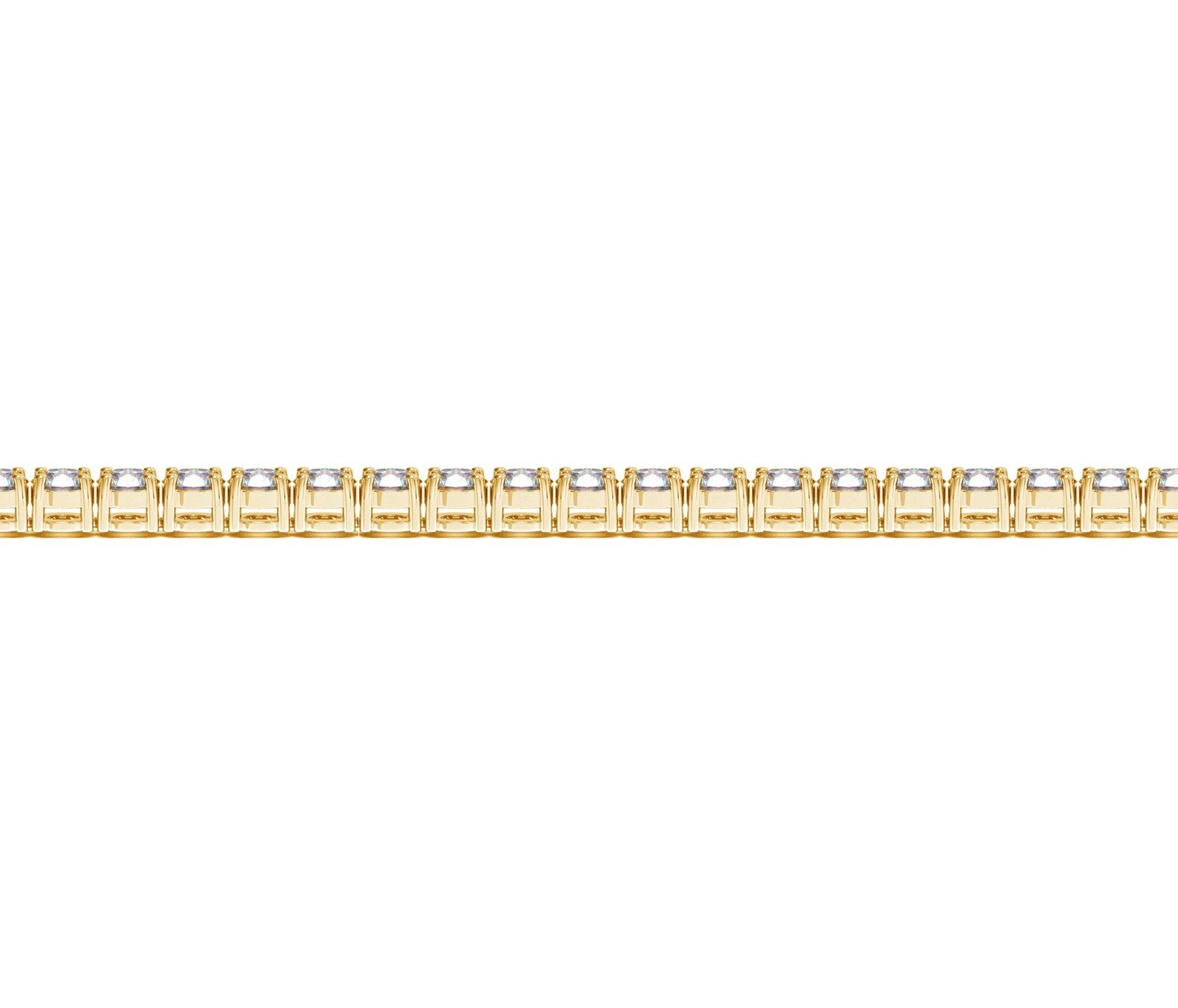 Classic four prong 5 carat total weight diamond tennis bracelet showcasing perfectly matched brilliant round cut lab grown diamonds set in 14k yellow gold.