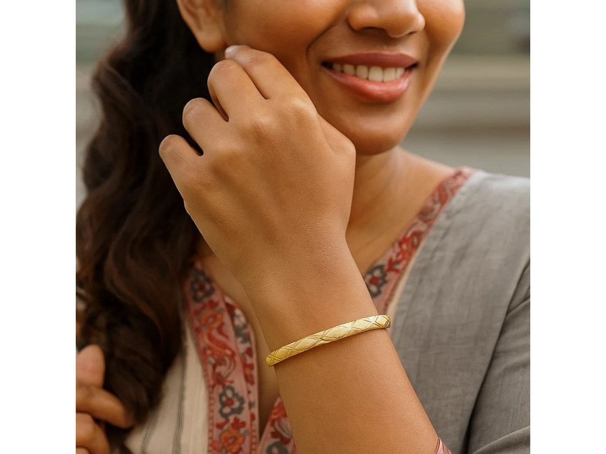 Weave-like diamond shape patterns in textured and smooth finish showcase the fabulous style of this slender bangle. Made of 10k yellow gold and comes in sizes 7 inches and 8 inches.