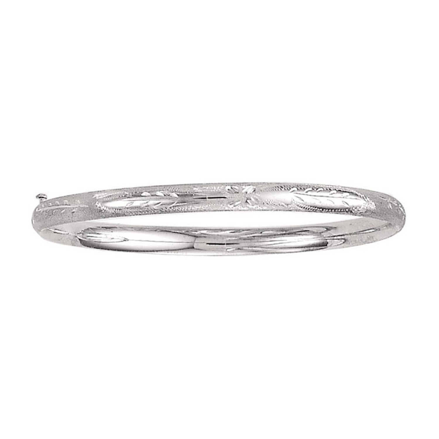 A classic floral carved high polish children bangle crafted in 14k white gold with a hidden clasp.