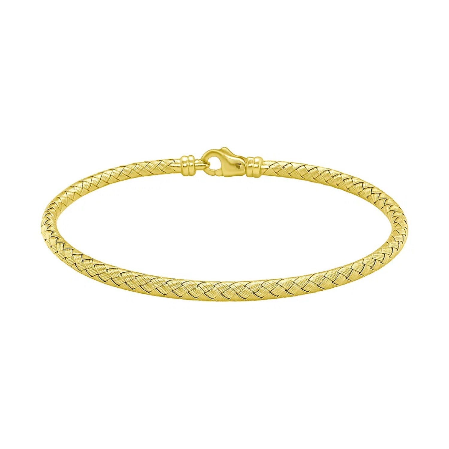 14k yellow gold, this bangle features a weave design and measures 3.0 millimeters in width. Secured with a lobster clasp.