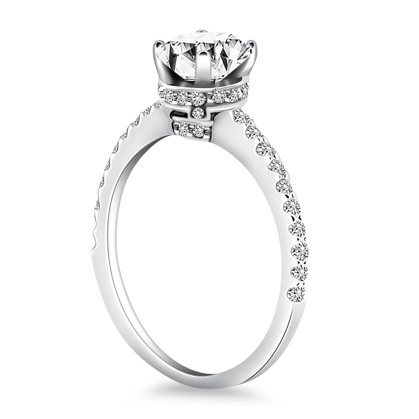 A double row of diamonds set beneath the center diamond adds beauty and grace to this diamond engagement ring accented with sparkling diamonds set along the shank; this ring is expertly crafted and full of beautiful surprises. The center highlights a sparkling 1/2 carat round cut diamond.