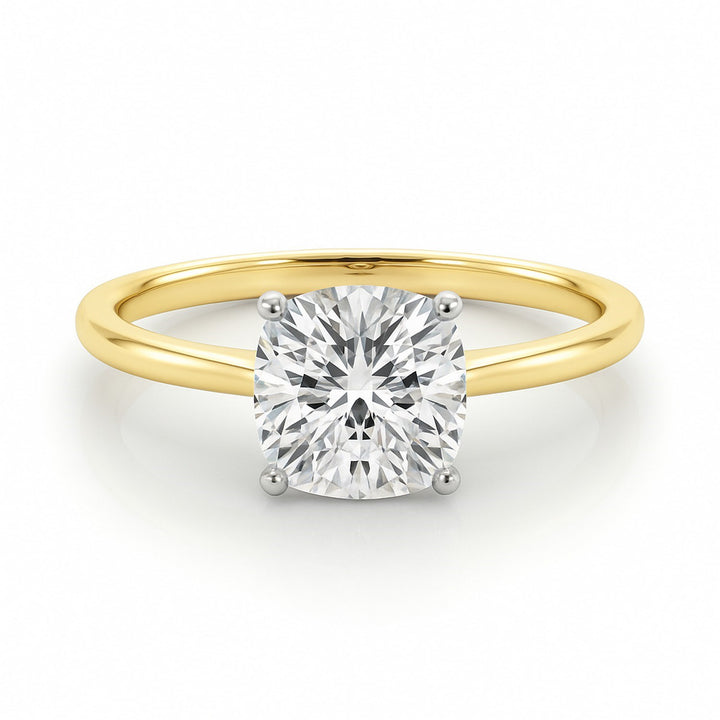 Celebrate life’s most meaningful moments with this breathtaking 2 carat cushion-cut lab-grown diamond solitaire ring a flawless fusion of timeless elegance and contemporary style. IGI certified with G color and VS1 clarity, the diamond sparkles with exceptional brilliance and outstanding quality you can trust. Set in a classic four-prong 14K white gold head and complemented by a polished 14K yellow gold band, the sophisticated two-tone design creates a stunning contrast that’s both traditional and modern. Whether it’s for a proposal, anniversary, or a once-in-a-lifetime milestone, this masterfully crafted ring is designed to be cherished forever.
