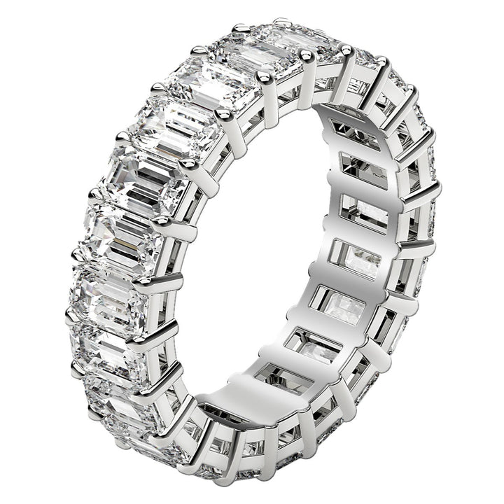 This dramatic eternity band features the traditional shine of 14k white gold, and the unparalleled sophistication of beautiful prong-set emerald cut lab grown diamonds. The light it radiates is as eternal and bright as the emotion it symbolizes.